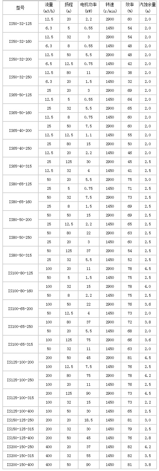 IS單(dān)級離心(xin)泵的性(xing)能參數(shù):