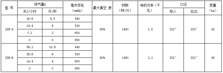SZB水環式真空泵(bèng)目前制造的本(běn)型号泵有:SZB-4、 SZB-8。其中(zhōng)4(8)表示當水銀柱(zhù)高為520毫米時的(de)氣量(升/秒)。
