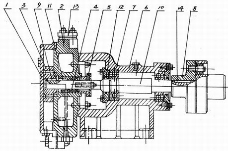 8. 聯軸器 9.葉輪(lún)平健 10.泵軸 11.填料(liào)環 12.軸承壓蓋 13.法(fa)蘭盤 14.聯軸器平(ping)健