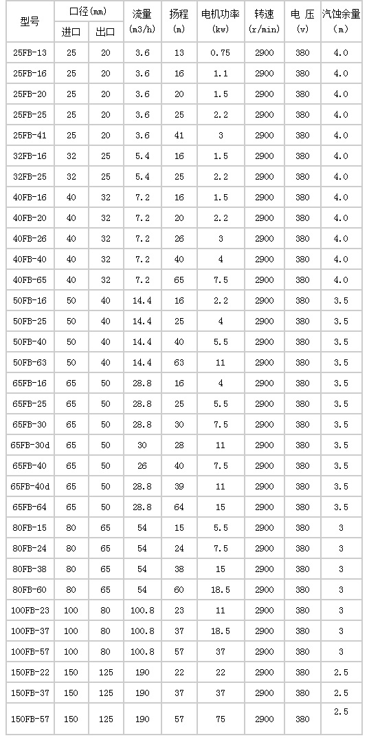 三(sān)、技術參數: FB、AFB型(xing)耐腐蝕離心(xīn)化工泵